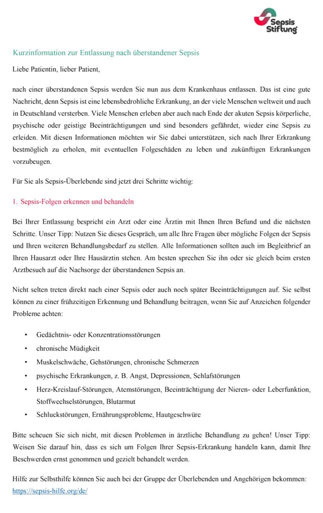 Auf Anregung der Patientenvertretung im Gemeinsamen Bundesausschuss (G-BA) hat die Sepsis-Stiftung eine Kurzinformation entwickelt und erprobt. Nach überstandener Sepsis kann diese Kurzinformation bei der Entlassung mitgegeben werden.